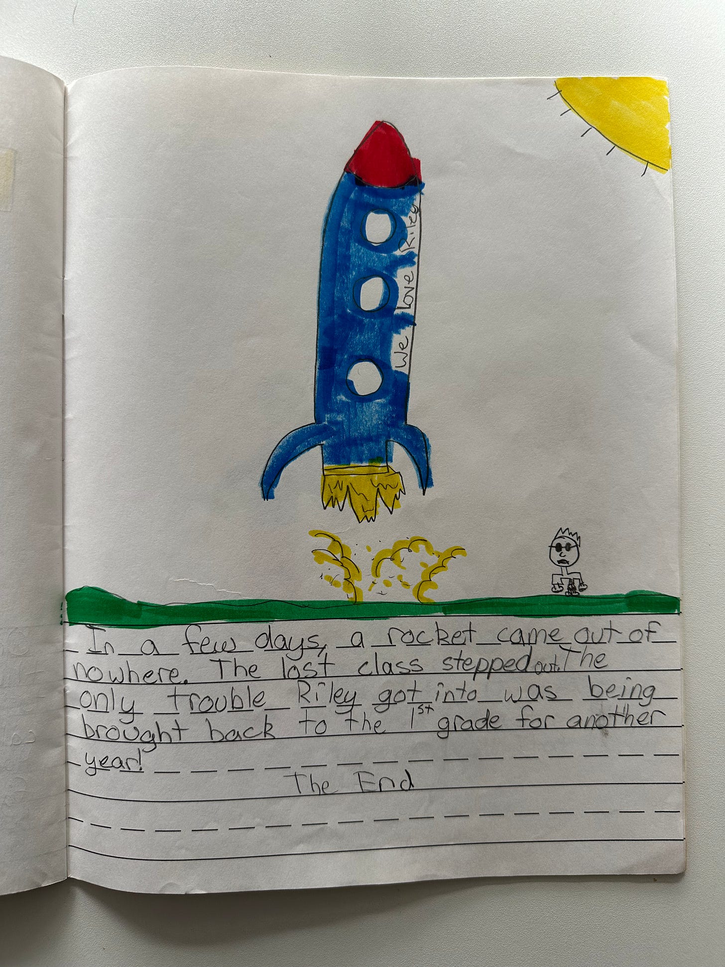 In a few days, a rocket came out of nowhere. The lost class stepped out. The only trouble Riley got into was being brought back to the 1st grade for another year! The End