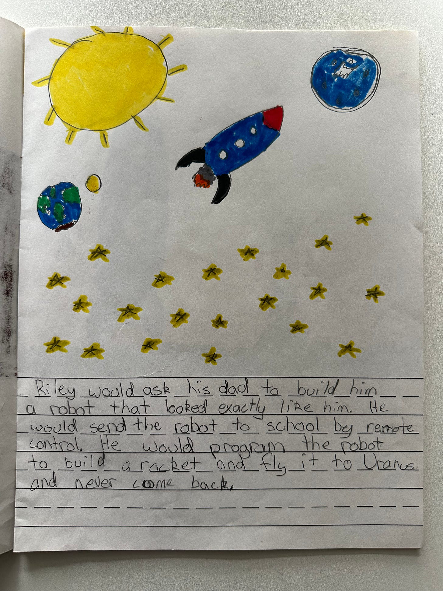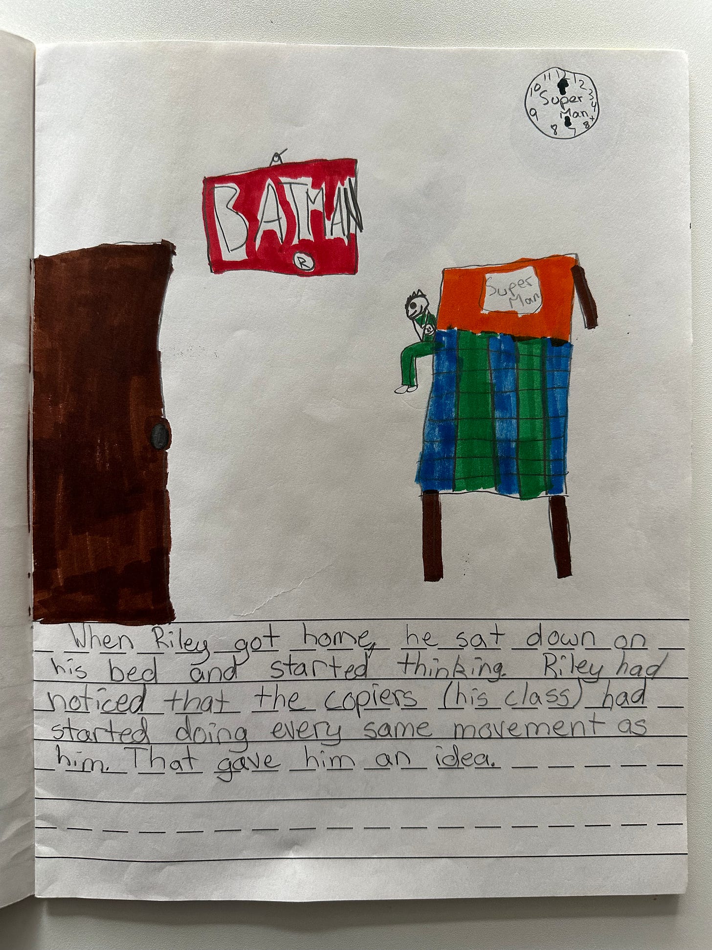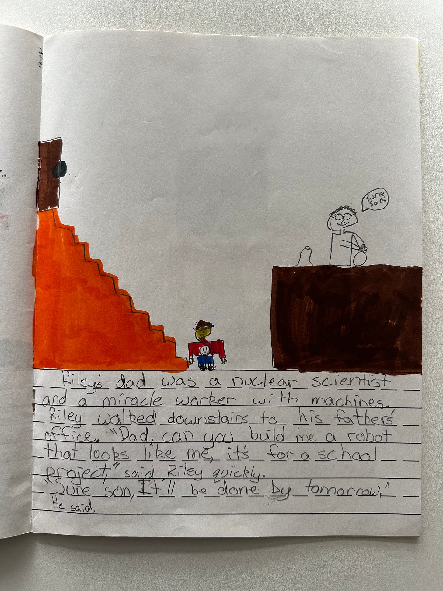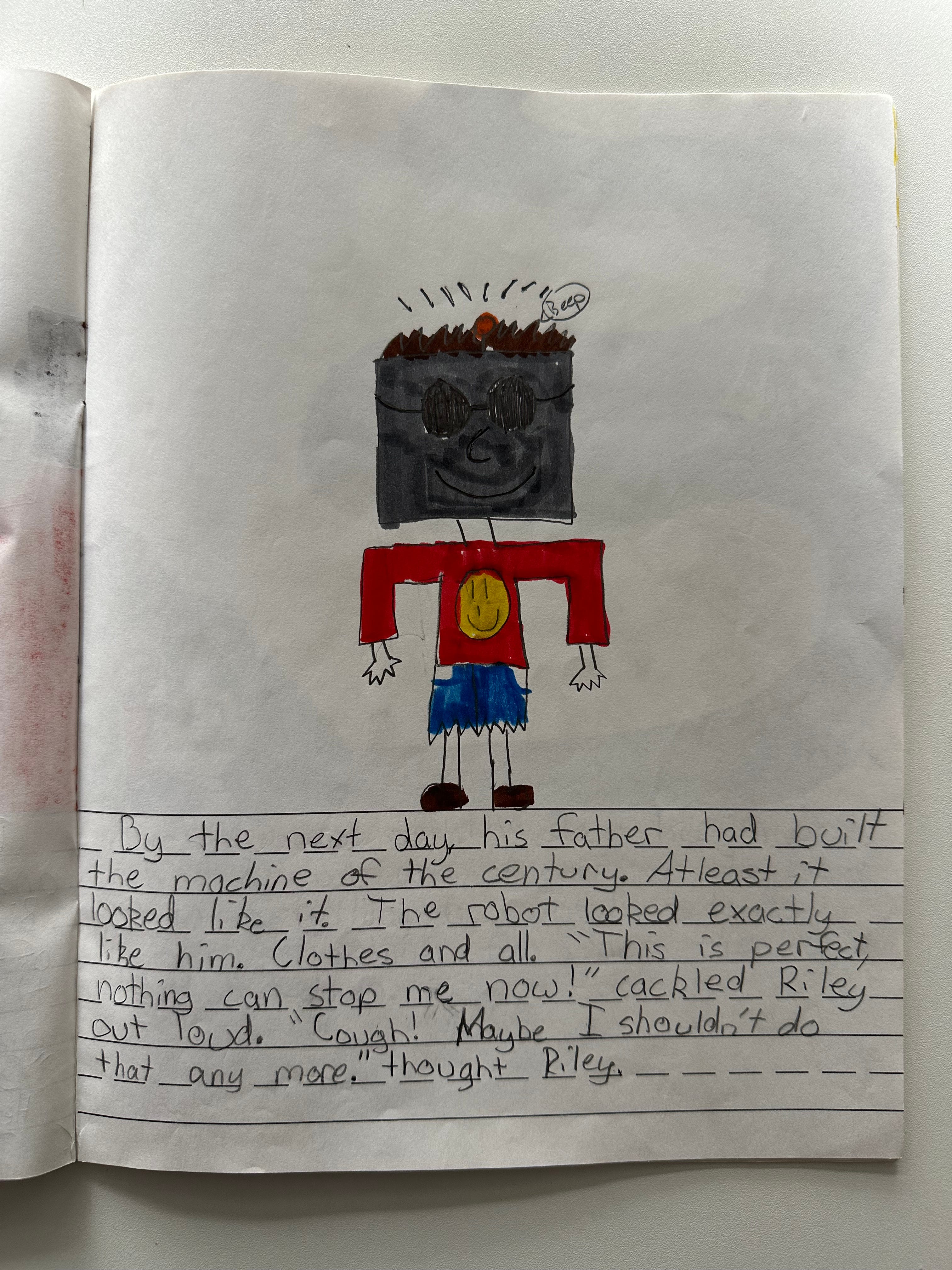 Riley’s dad was a nuclear scientist and a miracle worker with machines. Riley walked downstairs to his father’s office. “Dad, can you build me a robot that looks like me, it’s for a school project,” said Riley quickly. “Sure son, It’ll be done by tomorrow,” He said.