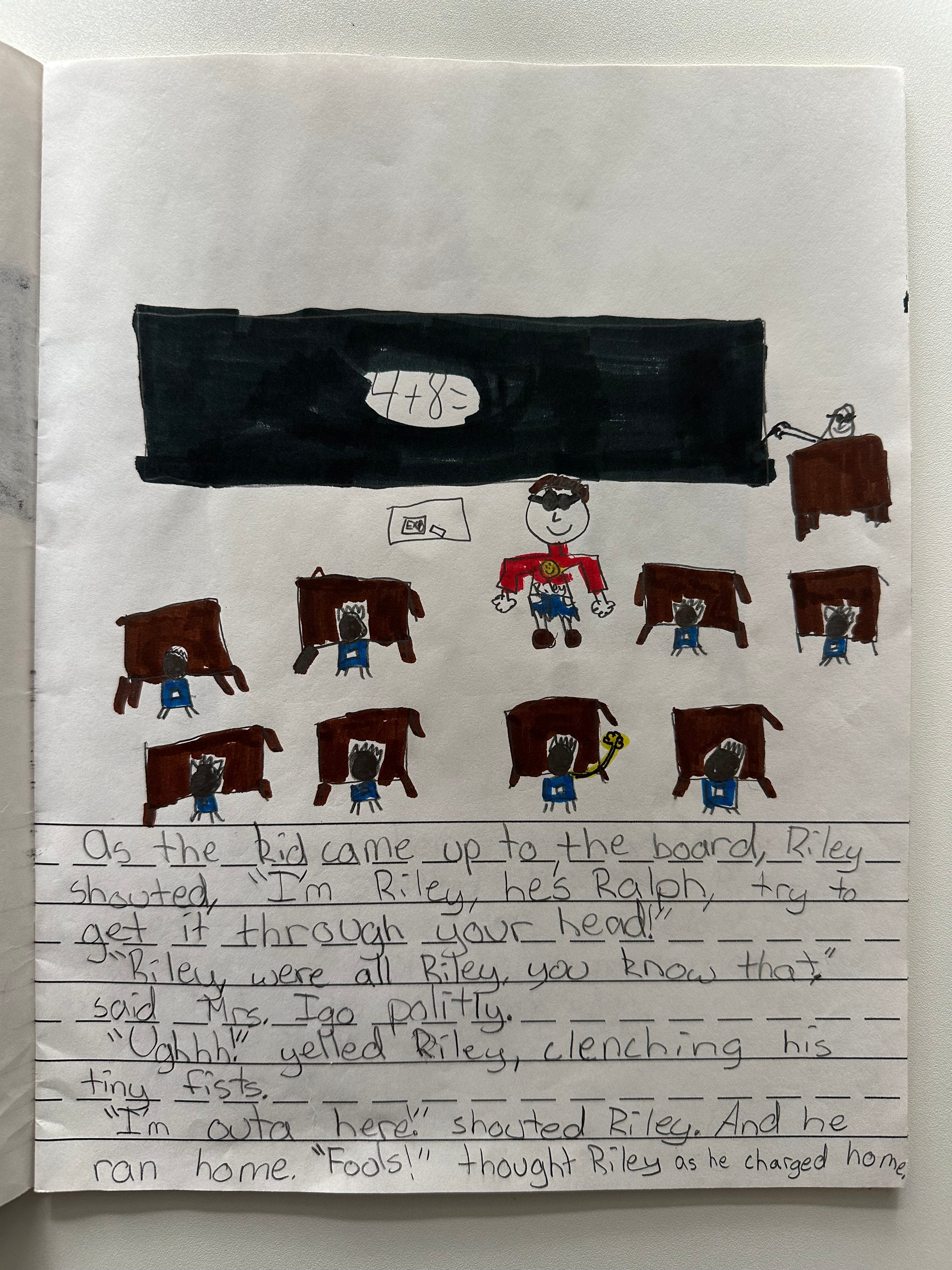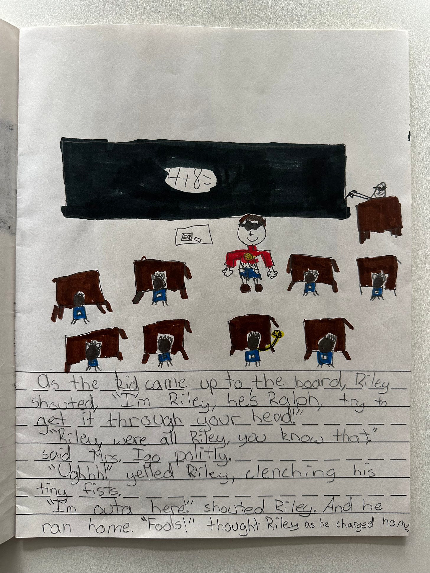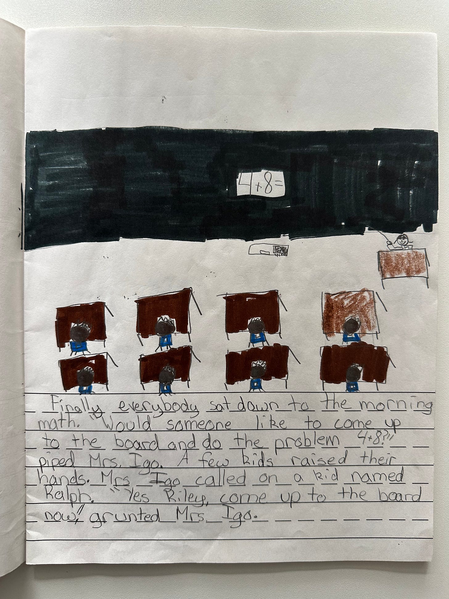 Finally everybody sat down to the morning math. “Would someone like to come up to the board and do the problem 4+8?” piped Mrs. Igo. A few kids raised their hands. Mrs. Igo called on a kid named Ralph. “Yes Riley, come up to the board now,” grunted Mrs. Igo.