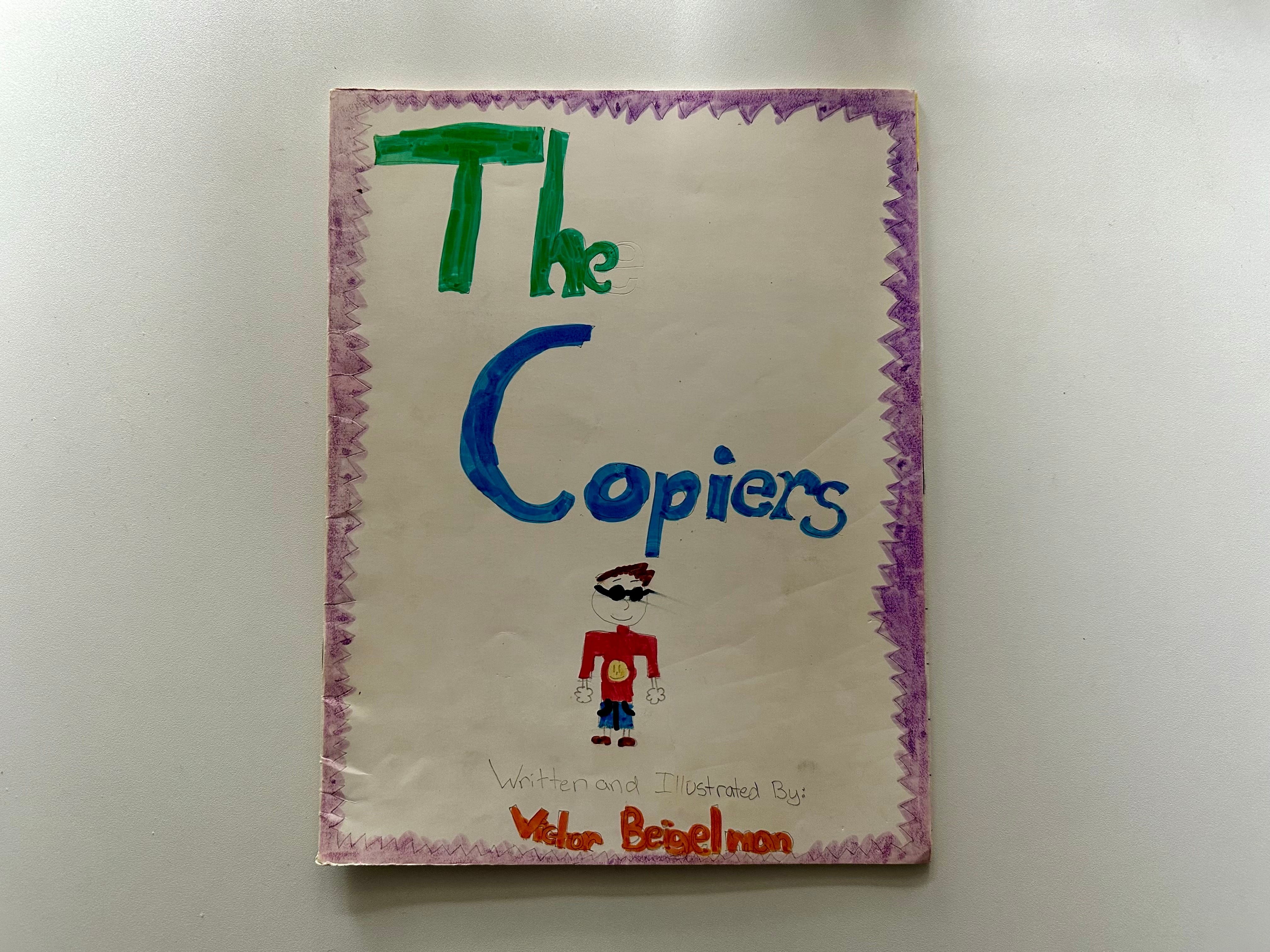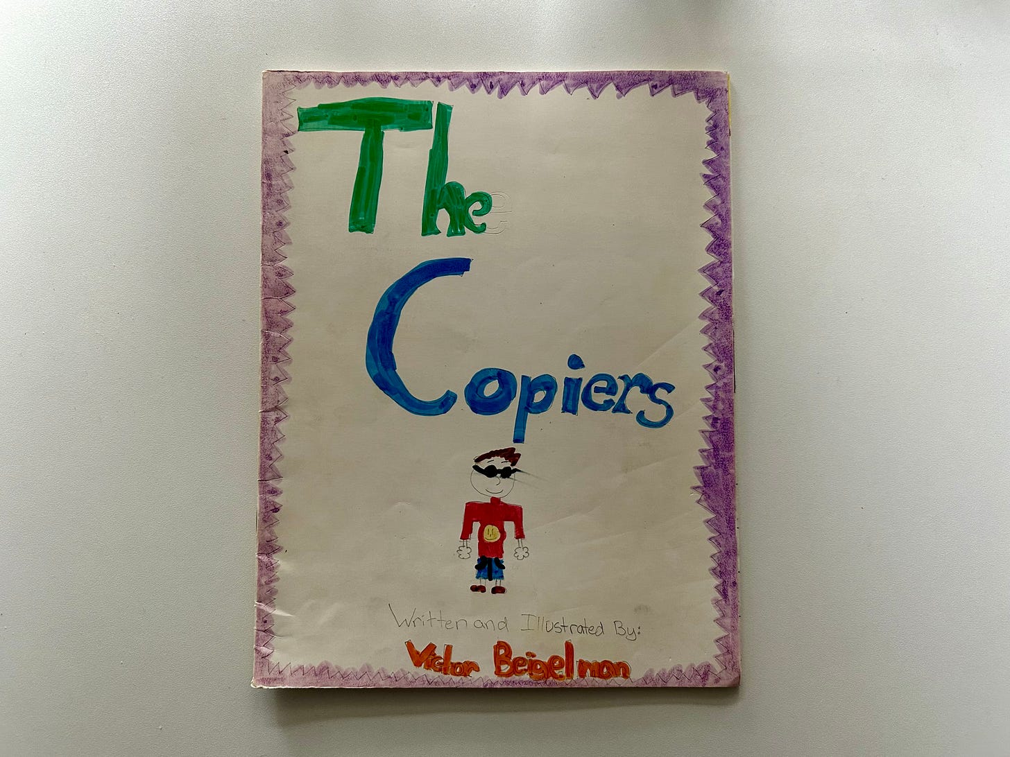 What all of this glosses over is a lie. I’ve been framing up a journey for all of you to join me on—one that hopefully leads all the way from an unpublished work of long-form fiction to a book you can purchase and hold in your hands. The truth, however, is that I’ve already written a book that exists in physical form. It’s been in print for almost 23 years and it’s called The Copiers. It follows a young boy named Riley who is surprised to learn that his entire first grade class (including the teacher) has begun to dress like him, act like him, and even respond to his name. To make amends for misleading you, my dear audience, I’m publishing pictures of it in full below, with some commentary. Unfortunately there’s only one copy, so if you’d like to purchase it, you’ll have to pay up bigtime. Feel free to email me directly with your bid.