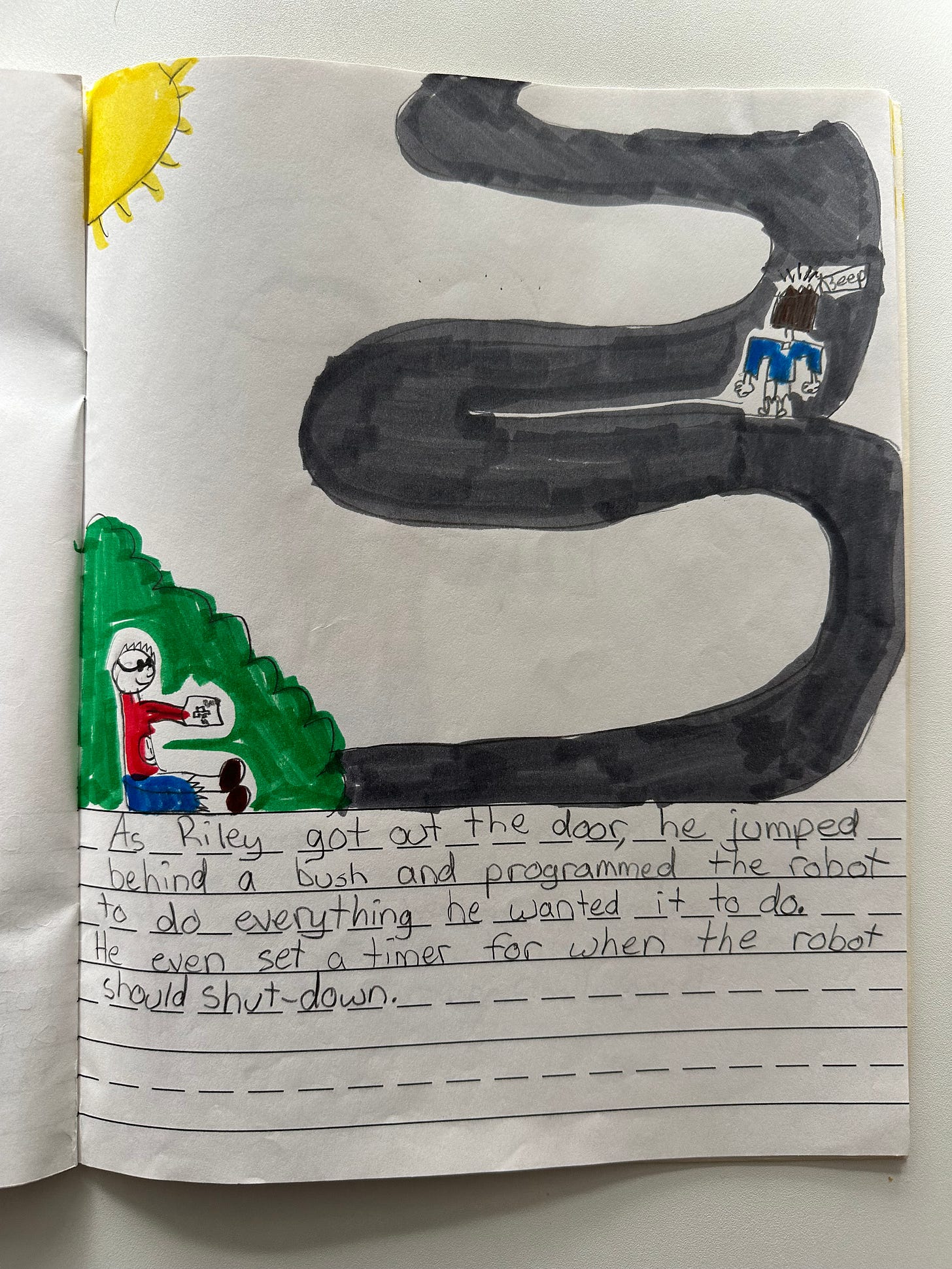 As Riley got out the door, he jumped behind a bush and programmed the robot to do everything he wanted it to do. He even set a timer for when the robot should shut-down.