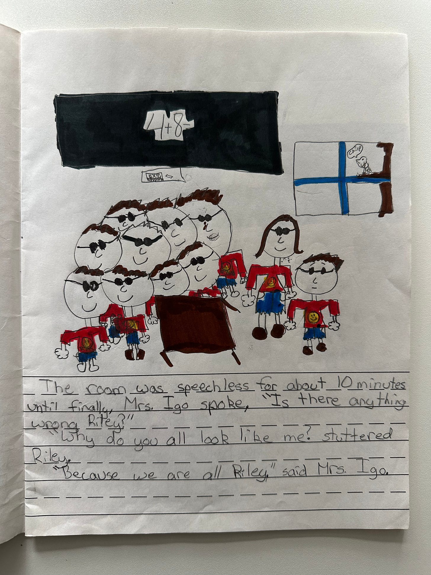 The room was speechless for about 10 minutes until finally, Mrs. Igo spoke, “Is there anything wrong, Riley?” “Why do you all look like me? stuttered Riley. “Because we are all Riley,” said Mrs. Igo.