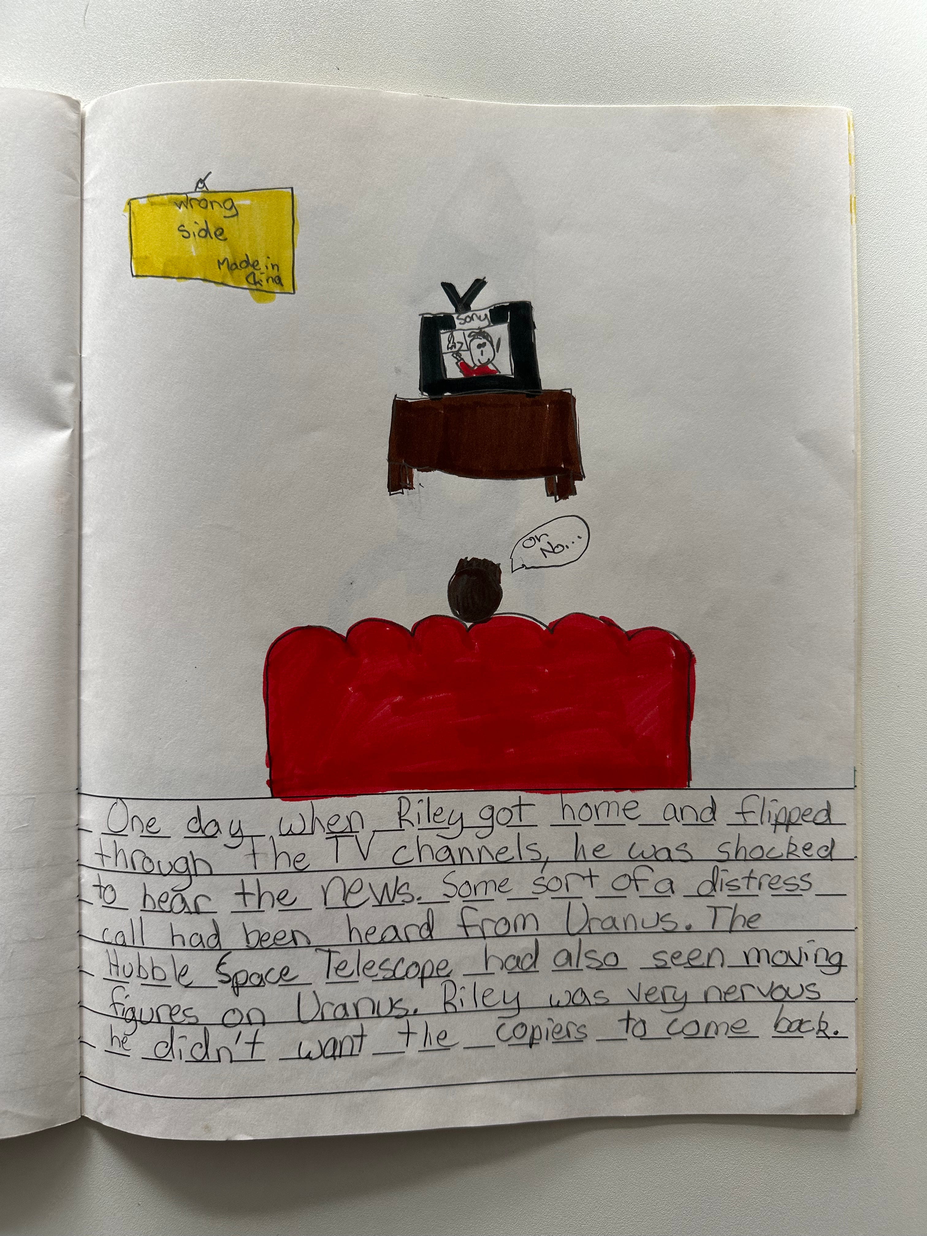 One day when Riley got home and flipped through the TV channels, he was shocked to hear the news. Some sort of a distress call had been heard from Uranus. The Hubble Space Telescope had also seen moving figures on Uranus. Riley was very nervous he didn’t want the copiers to come back.