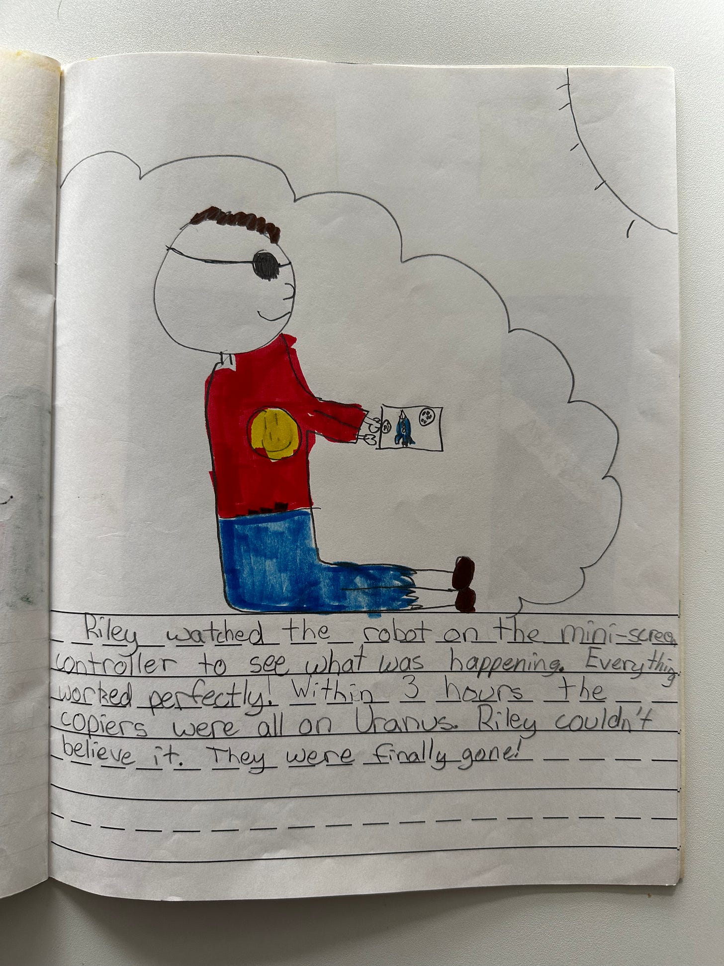 Riley watched the robot on the mini-screen controller to see what was happening. Everything worked perfectly! Within 3 hours the copiers were all on Uranus. Riley couldn’t believe it. They were finally gone!