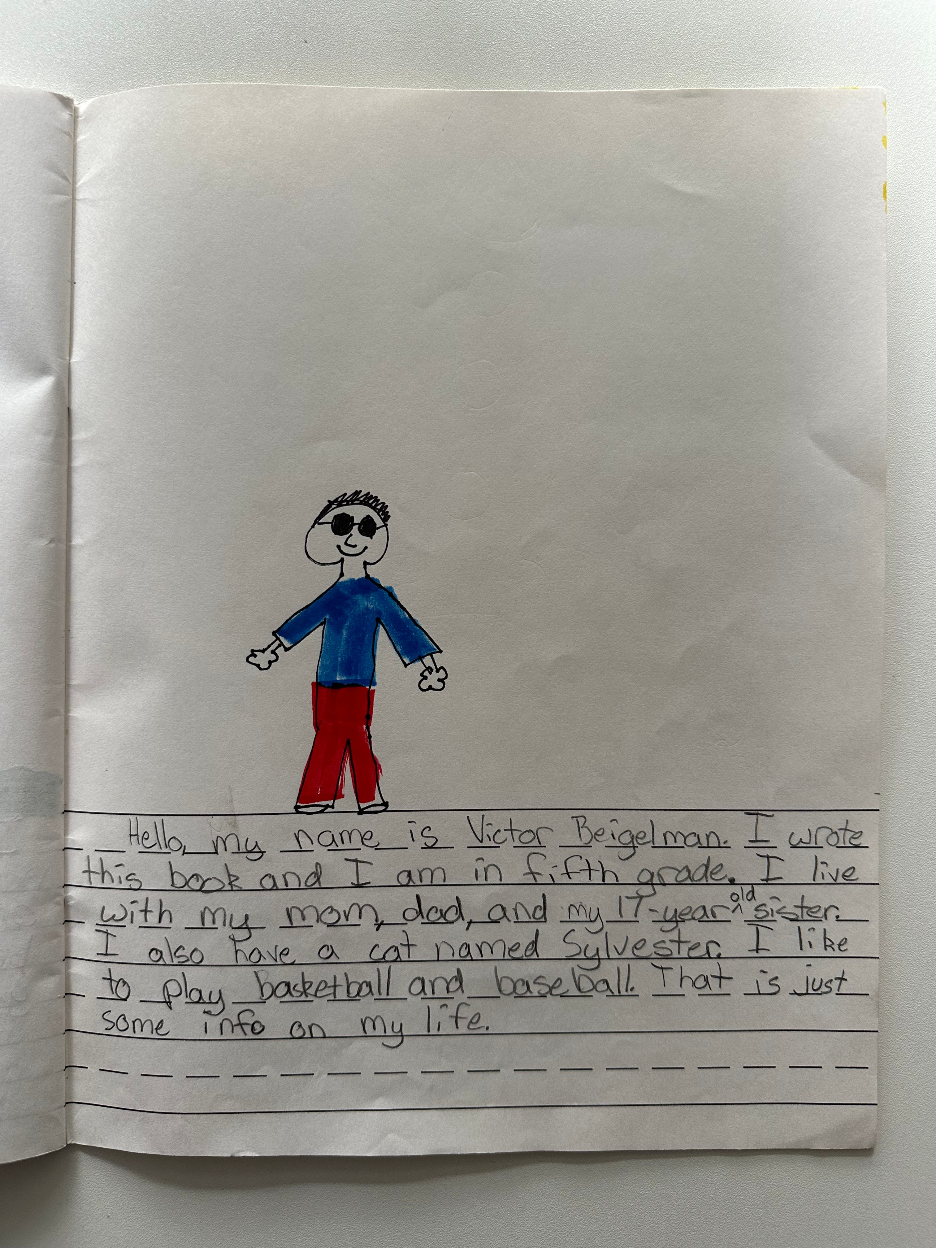 Hello, my name is Victor Beigelman. I wrote this book and I am in fifth grade. I live with my mom, dad, and my 17-year-old sister. I also have a cat named Sylvester. I like to play basketball and baseball. That is just some info on my life.
