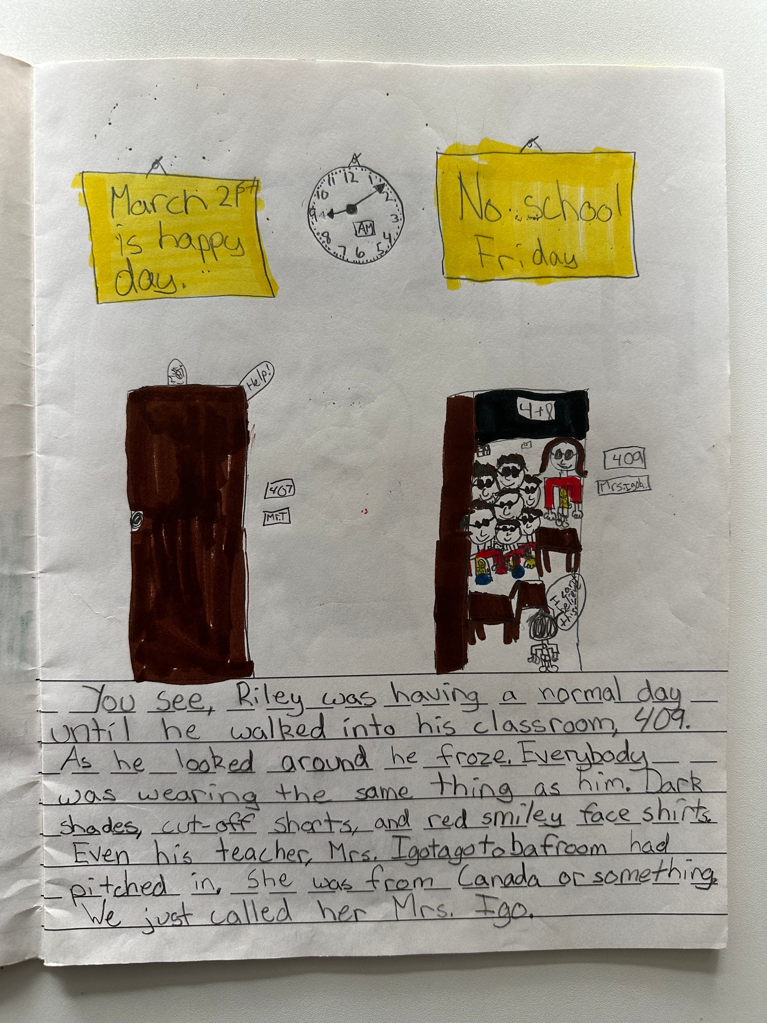 You see, Riley was having a normal day until he walked into his classroom, 409. As he looked around he froze. Everybody was wearing the same thing as him. Dark shades, cut-off shorts, and red smiley face shirts. Even his teacher, Mrs. Igotagotobafroom had pitched in. She was from Canada or something. We just called her Mrs. Igo.